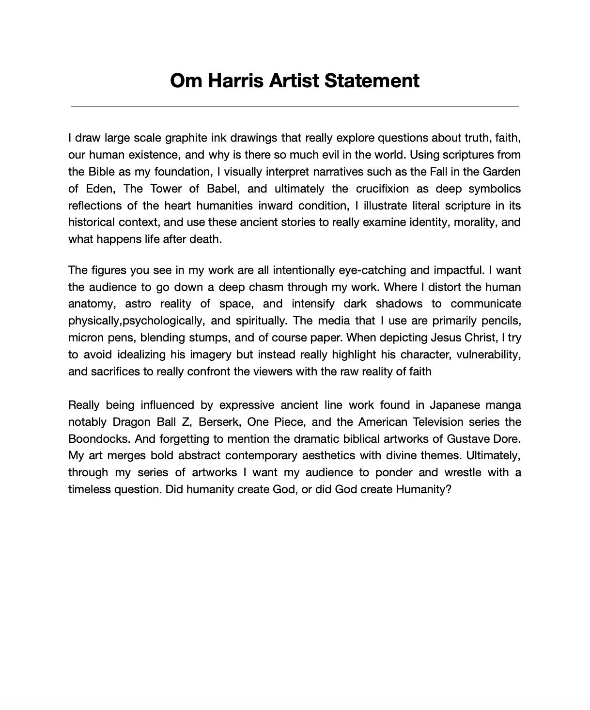 Hello everyone,I create large scale graphite and ink drawings that explore faith, reason and the moral struggles of human existence. Drawing from biblical scriptures as symbolic frameworks and literal illustrations, my work examines the questions of truth, identity, and the presence of evil in the world. Through deep imagery and negative space, I invite viewers regardless of belief to reflect on meaning, purpose, and the tension between what is the reason of their existence.Jesus says, “I am the way, the truth, and the life. No one comes to the Father except through Me -John 14:6